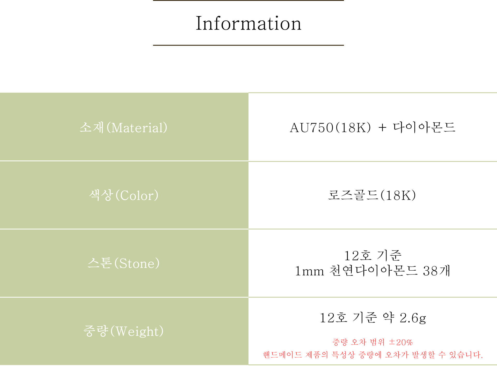 중량 | 아반주얼리에서 만들어지는 귀금속 제품은 핸드메이드 제품들로 표기 중량과 오차(± 10%)가 발생할 수 있습니다. *각 제품의 중량은 상세 페이지 참고 |