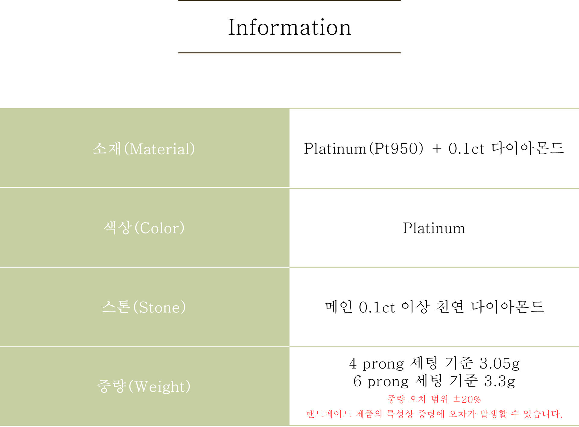 중량 | 아반주얼리에서 만들어지는 귀금속 제품은 핸드메이드 제품들로 표기 중량과 오차(± 10%)가 발생할 수 있습니다. *각 제품의 중량은 상세 페이지 참고 |