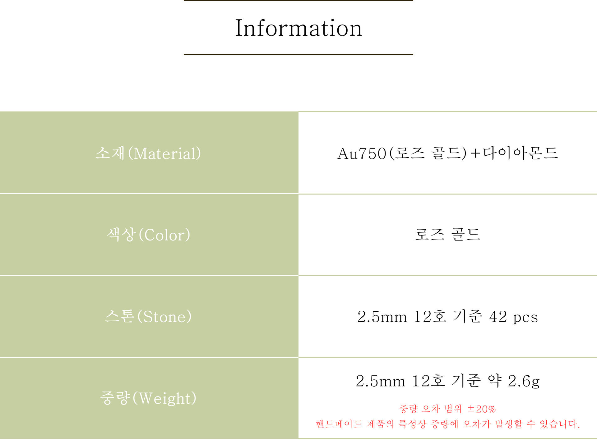 중량 | 아반주얼리에서 만들어지는 귀금속 제품은 핸드메이드 제품들로 표기 중량과 오차(± 10%)가 발생할 수 있습니다. *각 제품의 중량은 상세 페이지 참고 |