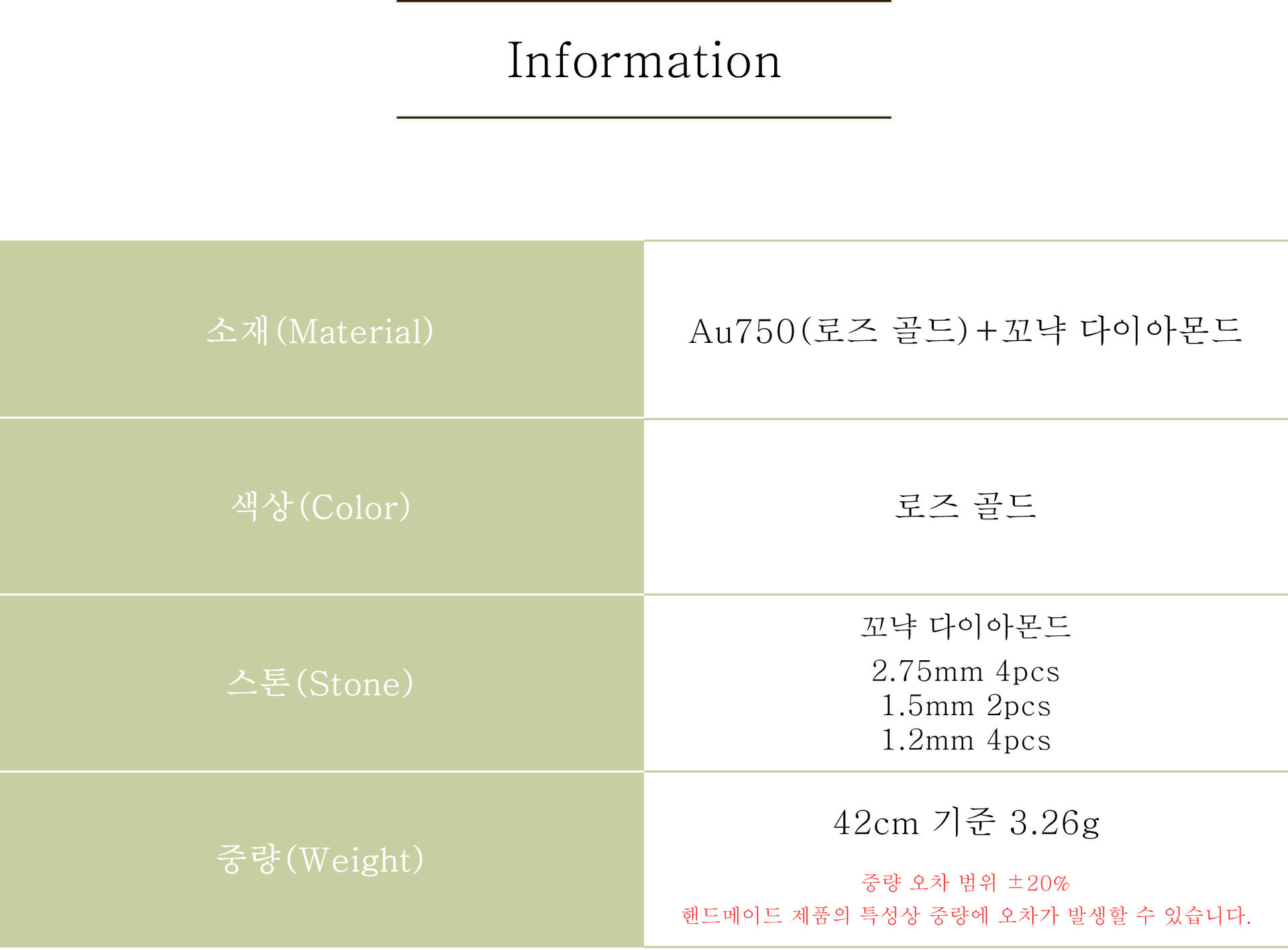 소재 및 함량 | 14K(Au585), 18K(Au750), 플래티넘(Pt950) 귀금속 제품은 KS 표준 함량을 준수합니다. *각 제품의 소재는 상세 페이지 참고 |